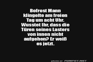 | Der Bofrost Mann Bild (38.23 KB) 2Lustiges → klasse Sprüche und Witze | Lustiges → klasse Sprüche und Witze | 30.10.24-10:36 | ||