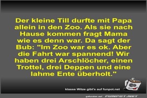 | Der kleine Till durfte mit Papa allein in den Zoo Bild (51.24 KB) 3Lustiges → klasse Sprüche und Witze | Lustiges → klasse Sprüche und Witze | 25.10.24-12:25 | Fossy | |