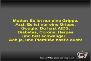 | Mutter: Es ist nur eine Grippe Bild (33.01 KB) 3Lustiges → klasse Sprüche und Witze | Lustiges → klasse Sprüche und Witze | 13.09.-13:50 | Fossy | |