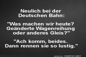 | Deutsche Bahn: Das tägliche Abenteuer Bild (76.57 KB) 9Lustiges → klasse Sprüche und Witze | Lustiges → klasse Sprüche und Witze | 13.09.-08:44 | ||
