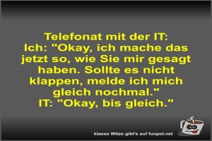 | Telefonat mit der IT Bild (40 KB) 3Lustiges → klasse Sprüche und Witze | Lustiges → klasse Sprüche und Witze | 15.09.-09:31 | Fossy | |