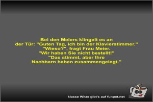 | Bei den Meiers klingelt es an der Tür Bild (26.08 KB) 2Lustiges → klasse Sprüche und Witze | Lustiges → klasse Sprüche und Witze | 13.09.-18:24 | Fossy | |