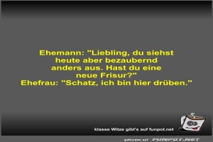 | Ehemann: Liebling, du siehst heute aber bezaubernd anders Bild (24.95 KB) 1Lustiges → klasse Sprüche und Witze | Lustiges → klasse Sprüche und Witze | 18.10.24-09:43 | Fossy | |