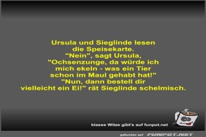 | Ursula und Sieglinde lesen die Speisekarte Bild (30.63 KB) 3Lustiges → klasse Sprüche und Witze | Lustiges → klasse Sprüche und Witze | 18.10.24-12:26 | Fossy | |