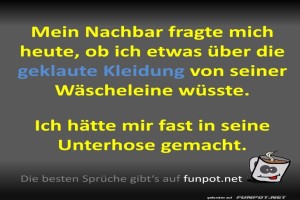 | Geklaute Kleidung Bild (86.67 KB) 6Lustiges → klasse Sprüche und Witze Zum Glück sind mir solche Nachbarn, die Wäsche klauen, bisher erspart geblieben ;-) | Lustiges → klasse Sprüche und Witze | 16.10.24-14:06 | ||