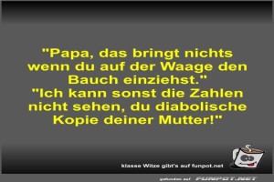 | Papa, das bringt nichts wenn du auf der Waage den Bauch... Bild (37.34 KB) 5Lustiges → klasse Sprüche und Witze | Lustiges → klasse Sprüche und Witze | 15.10.24-09:43 | Fossy | |