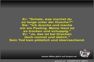 | Er: Schatz, was machst du so lange unter der Dusche? Bild (33.76 KB) 4Lustiges → klasse Sprüche und Witze | Lustiges → klasse Sprüche und Witze | 13.10.24-14:11 | Fossy | |