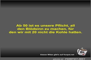 | Ab 50 ist es unsere Pflicht Bild (21.36 KB) von Fossy am 08. Oktober 2024 um 10:59 Uhr Lustiges → klasse Sprüche und Witze | Lustiges → klasse Sprüche und Witze | 08.10.24-10:59 | Fossy | ||
