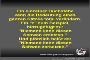 | Ein einzelner Buchstabe kann die Bedeutung eines ganzen... Bild (46.02 KB) 5Lustiges → klasse Sprüche und Witze | Lustiges → klasse Sprüche und Witze | 11.10.24-11:35 | Fossy | |
