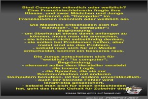| Sind Computer männlich oder weiblich? Bild (91.31 KB) 4Lustiges → klasse Sprüche und Witze | Lustiges → klasse Sprüche und Witze | 09.10.24-12:43 | Fossy | |