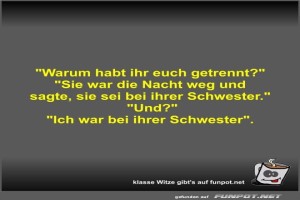 | Warum habt ihr euch getrennt? Bild (27.39 KB) 2Lustiges → klasse Sprüche und Witze | Lustiges → klasse Sprüche und Witze | 30.09.24-10:27 | Fossy | |