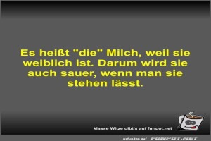 | Es heißt "die" Milch, weil sie weiblich ist Bild (26.67 KB) 2Lustiges → klasse Sprüche und Witze | Lustiges → klasse Sprüche und Witze | 22.09.24-13:11 | Fossy | |