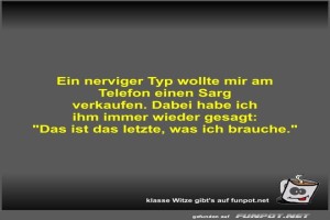 | Ein nerviger Typ wollte mir am Telefon einen Sarg verkaufen Bild (27.46 KB) 1Lustiges → klasse Sprüche und Witze | Lustiges → klasse Sprüche und Witze | 19.09.24-13:20 | Fossy | |