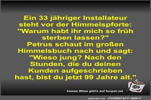 | Ein 33 jähriger Installateur steht vor der Himmelspforte Bild (51.03 KB) 1Lustiges → klasse Sprüche und Witze | Lustiges → klasse Sprüche und Witze | 18.08.24-09:40 | Fossy | |