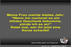 | Meine Frau meinte letztes Jahr Bild (32.34 KB) 1Lustiges → klasse Sprüche und Witze | Lustiges → klasse Sprüche und Witze | 15.08.24-13:02 | Fossy | |