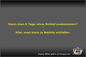 | Kann man 8 Tage ohne Schlaf auskommen? Bild (17.71 KB) 1Lustiges → klasse Sprüche und Witze | Lustiges → klasse Sprüche und Witze | 01.09.-19:35 | Fossy | |