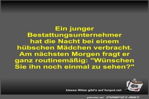 | Ein junger Bestattungsunternehmer hat die Nacht bei einem... Bild (38.44 KB) 3Lustiges → klasse Sprüche und Witze | Lustiges → klasse Sprüche und Witze | 22.07.24-13:29 | Fossy | |