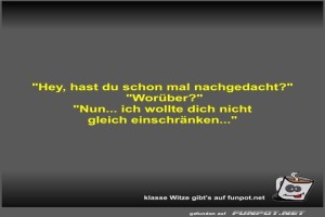 | Hey, hast du schon mal nachgedacht? Bild (21.41 KB) 2Lustiges → klasse Sprüche und Witze | Lustiges → klasse Sprüche und Witze | 23.07.24-18:08 | Fossy | |