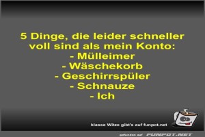 | 5 Dinge, die leider schneller voll sind als mein Konto Bild (30.27 KB) 3Lustiges → klasse Sprüche und Witze | Lustiges → klasse Sprüche und Witze | 21.07.24-10:10 | Fossy | |