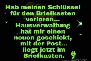 | Schlüssel verloren Bild (79.82 KB) 3Lustiges → klasse Sprüche und Witze | Lustiges → klasse Sprüche und Witze | 20.07.24-11:33 | ||