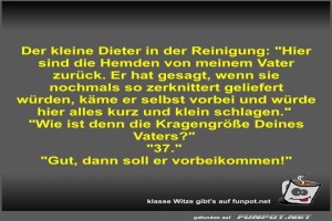 | Der kleine Dieter in der Reinigung Bild (48.07 KB) 4Lustiges → klasse Sprüche und Witze | Lustiges → klasse Sprüche und Witze | 20.07.24-12:29 | Fossy | |