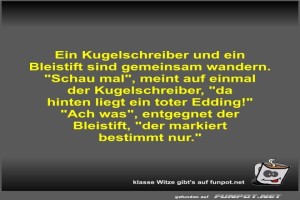 | Ein Kugelschreiber und ein Bleistift sind gemeinsam wandern Bild (39.02 KB) 1Lustiges → klasse Sprüche und Witze | Lustiges → klasse Sprüche und Witze | 11.07.24-14:01 | Fossy | |