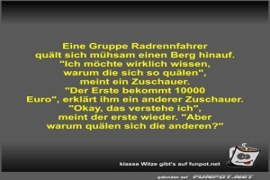| Eine Gruppe Radrennfahrer quält sich mühsam einen Berg... Bild (42.38 KB) 1Lustiges → klasse Sprüche und Witze | Lustiges → klasse Sprüche und Witze | 07.07.24-09:37 | Fossy | |