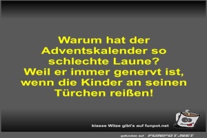 | Warum hat der Adventskalender so schlechte Laune? Bild (33.72 KB) von Fossy am 01. Juni 2024 um 12:02 Uhr Lustiges → klasse Sprüche und Witze | Lustiges → klasse Sprüche und Witze | 01.06.24-12:02 | Fossy | ||