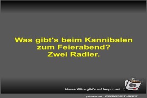 | Was gibt's beim Kannibalen zum Feierabend? Bild (20.7 KB) 4Lustiges → klasse Sprüche und Witze | Lustiges → klasse Sprüche und Witze | 30.05.24-18:43 | Fossy | |