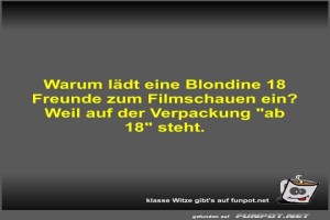 | Warum lädt eine Blondine 18 Freunde zum Filmschauen ein? Bild (25.63 KB) 1Lustiges → klasse Sprüche und Witze | Lustiges → klasse Sprüche und Witze | 19.05.24-11:08 | Fossy | |