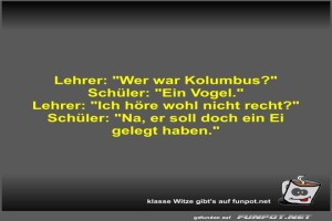 | Lehrer: Wer war Kolumbus? Bild (27.38 KB) 3Lustiges → klasse Sprüche und Witze | Lustiges → klasse Sprüche und Witze | 18.05.24-19:24 | Fossy | |