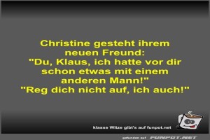 | Christine gesteht ihrem neuen Freund Bild (31.64 KB) 2Lustiges → klasse Sprüche und Witze | Lustiges → klasse Sprüche und Witze | 18.05.24-11:14 | Fossy | |