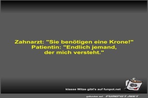 | Zahnarzt: "Sie benötigen eine Krone!" Bild (20.03 KB) 2Lustiges → klasse Sprüche und Witze | Lustiges → klasse Sprüche und Witze | 10.05.24-09:34 | Fossy | |