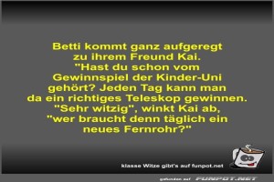 | Betti kommt ganz aufgeregt zu ihrem Freund Kai Bild (40.84 KB) 2Lustiges → klasse Sprüche und Witze | Lustiges → klasse Sprüche und Witze | 08.05.24-14:06 | Fossy | |