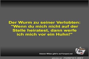 | Der Wurm zu seiner Verlobten Bild (27.75 KB) 2Lustiges → klasse Sprüche und Witze | Lustiges → klasse Sprüche und Witze | 26.04.24-11:48 | Fossy | |