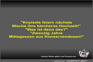 | "Kneisels feiern nächste Woche ihre blecherne Hochzeit!" Bild (27.29 KB) 4Lustiges → klasse Sprüche und Witze | Lustiges → klasse Sprüche und Witze | 27.04.24-10:50 | Fossy | |