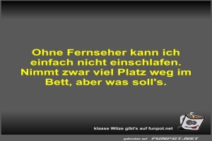 | Ohne Fernseher kann ich einfach nicht einschlafen Bild (27.45 KB) 5Lustiges → klasse Sprüche und Witze | Lustiges → klasse Sprüche und Witze | 26.04.24-19:00 | Fossy | |