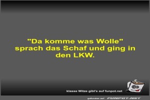 | "Da komme was Wolle" sprach das Schaf und ging in den LKW Bild (20.69 KB) 2Lustiges → klasse Sprüche und Witze | Lustiges → klasse Sprüche und Witze | 27.04.24-18:23 | Fossy | |
