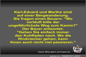 | Karl-Eduard und Martha sind auf einer Bergwanderung Bild (46.34 KB) 6Lustiges → klasse Sprüche und Witze | Lustiges → klasse Sprüche und Witze | 27.04.24-13:17 | Fossy | |