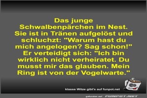 | Das junge Schwalbenpärchen im Nest Bild (48.45 KB) 1Lustiges → klasse Sprüche und Witze | Lustiges → klasse Sprüche und Witze | 28.04.24-09:59 | Fossy | |