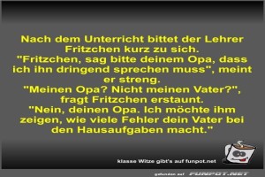 | Nach dem Unterricht bittet der Lehrer Fritzchen kurz zu sich Bild (50.29 KB) 4Lustiges → klasse Sprüche und Witze | Lustiges → klasse Sprüche und Witze | 19.04.24-12:50 | Fossy | |