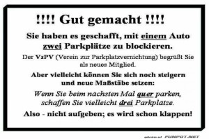 | Parkplatzmeister: Der Doppelte Blockierer! Bild (97.87 KB) 4Lustiges → klasse Sprüche und Witze | Lustiges → klasse Sprüche und Witze | 11.11.-09:15 | Wilhelmine | |