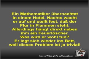 | Ein Mathematiker übernachtet in einem Hotel Bild (48.47 KB) von Fossy am 18. Oktober 2025 um 17:08 Uhr Lustiges → klasse Sprüche und Witze | Lustiges → klasse Sprüche und Witze | 18.10.-17:08 | Fossy | ||