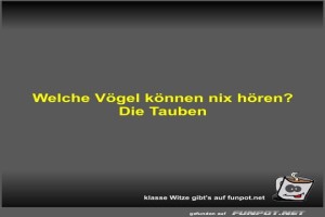 | Welche Vögel können nix hören? Bild (16.01 KB) 2Lustiges → klasse Sprüche und Witze | Lustiges → klasse Sprüche und Witze | 05.04.24-17:32 | Fossy | |