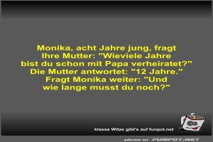 | Monika, acht Jahre jung, fragt Ihre Mutter Bild (32.56 KB) 4Lustiges → klasse Sprüche und Witze | Lustiges → klasse Sprüche und Witze | 06.04.24-17:38 | Fossy | |