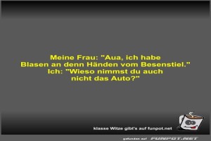 | Meine Frau: Aua, ich habe Blasen an denn Händen vom... Bild (21.4 KB) 5Lustiges → klasse Sprüche und Witze | Lustiges → klasse Sprüche und Witze | 06.04.24-13:11 | Fossy | |