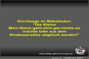 | Durchsage im Möbelladen Bild (27.91 KB) 3Lustiges → klasse Sprüche und Witze | Lustiges → klasse Sprüche und Witze | 03.04.24-10:08 | Fossy | |