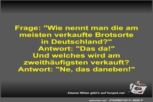 | Frage: Wie nennt man die am meisten verkaufte Brotsorte in Bild (38.09 KB) 6Lustiges → klasse Sprüche und Witze | Lustiges → klasse Sprüche und Witze | 28.03.24-13:47 | Fossy | |