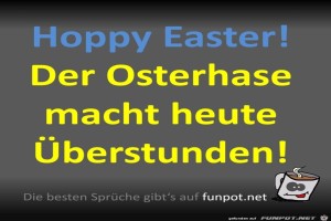 | Hoppy Easter Bild (69.69 KB) 5Lustiges → klasse Sprüche und Witze Wenn der Osterhase länger rumhoppeln und Überstunden machen muss, dann ist das eben nicht Happy, sondern Hoppy Easter ;-) | Lustiges → klasse Sprüche und Witze | 25.03.24-14:53 | ||