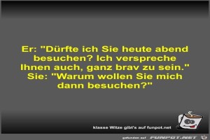 | Er: Dürfte ich Sie heute abend besuchen? Bild (31.14 KB) 4Lustiges → klasse Sprüche und Witze | Lustiges → klasse Sprüche und Witze | 12.03.24-18:07 | Fossy | |